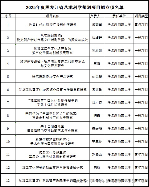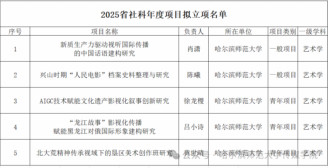 在黑龙江省哲学社会科学工作办公室公布的《2025年黑龙江省社科年度项目拟立项名单》中,我院获批立项项目5项,其中一般项目2项、青年项目3项。