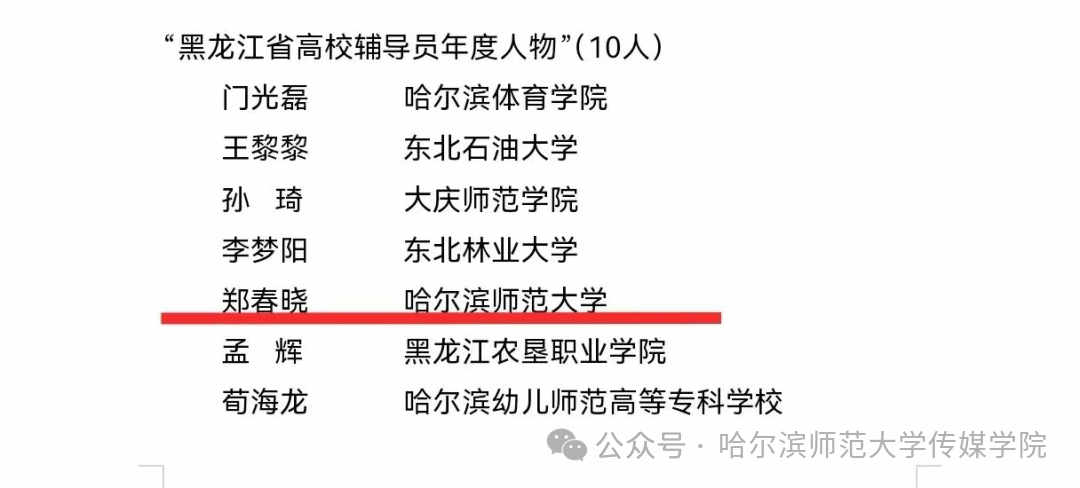 在学工战线上,由黑龙江省委宣传部、省委教育工委主办的2025年“龙江最美高校辅导员”暨第十七届“黑龙江省高校辅导员年度人物”推选展示活动中,我院辅导员郑春晓荣获第十七届“黑龙江省高校辅导员年度人物”荣誉称号。此项荣誉的取得,是我院持续加强辅导员队伍建设、落实“立德树人”根本任务,不断提升学生思想政治工作的实效性与专业化水平的体现。