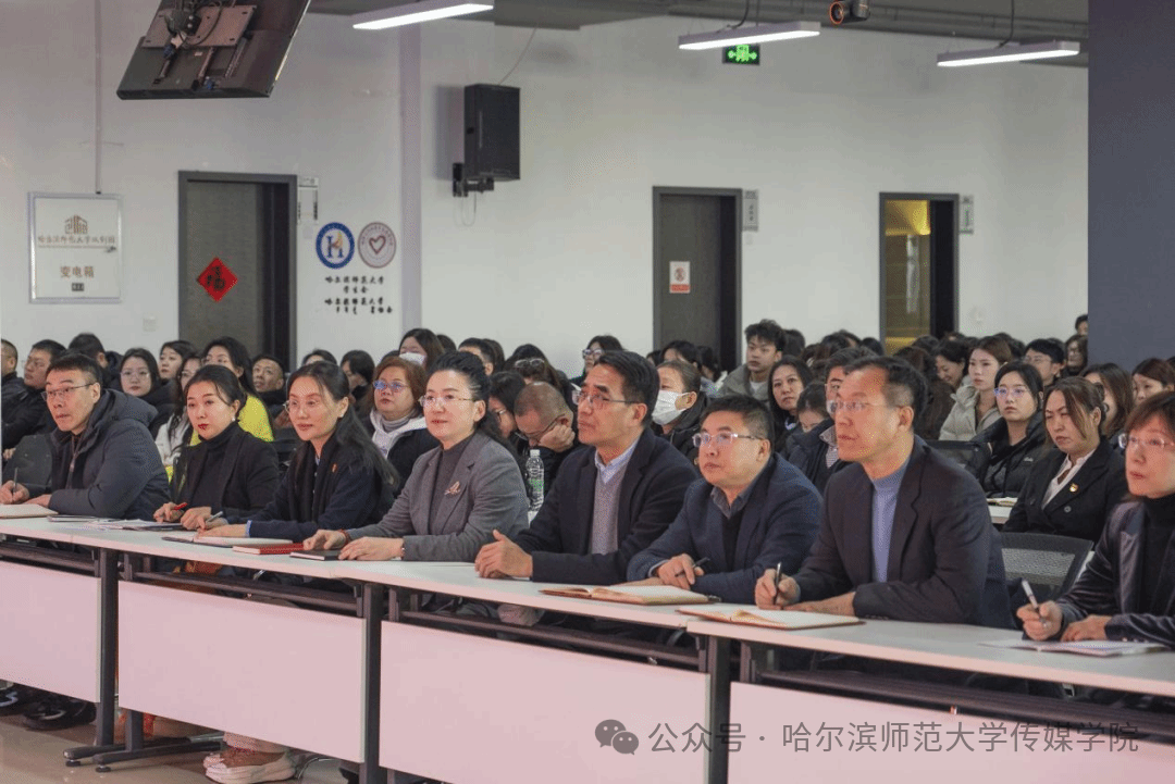 为深入学习贯彻党的二十届四中全会精神,凝聚思想共识,激发奋进力量,12月3日下午,党的二十届四中全会精神宣讲报告会在哈尔滨师范大学江南校区双创园二楼多功能厅举办,省委宣讲团成员、哈尔滨师范大学马克思主义学院李桃教授主讲。传媒学院班子成员、系主任、三办主任、党支部书记以及辅导员参加学习。