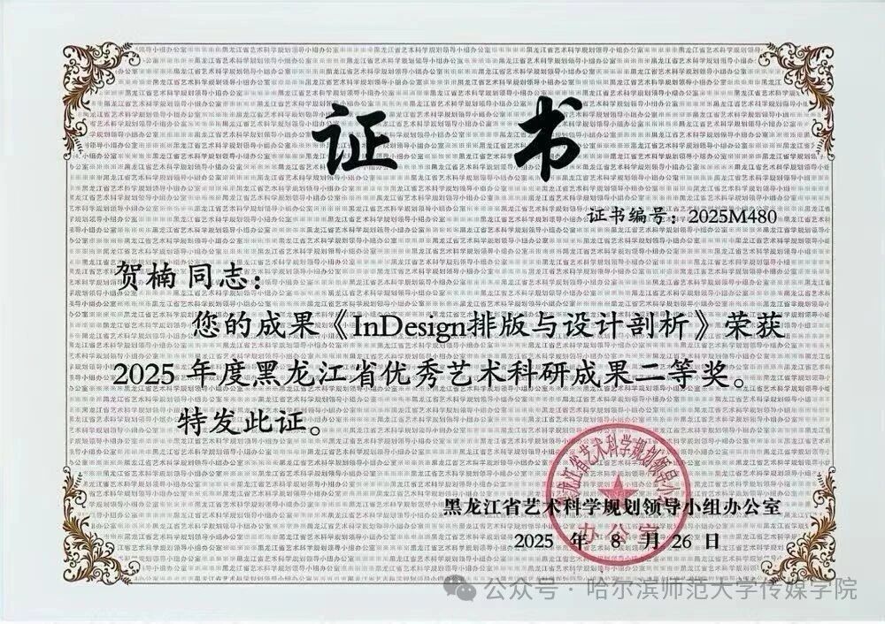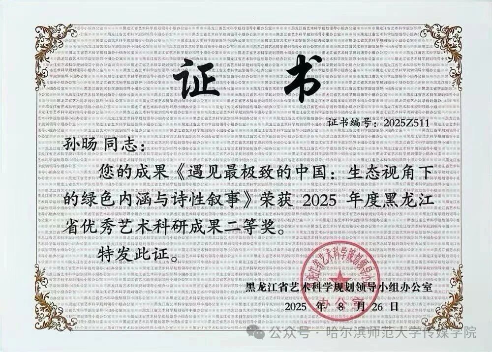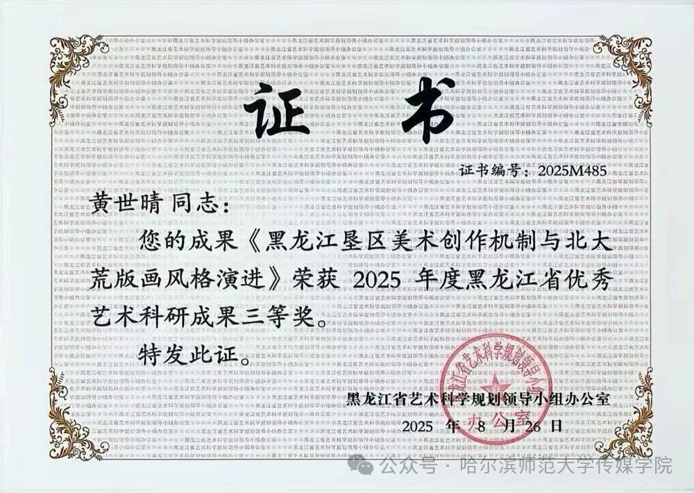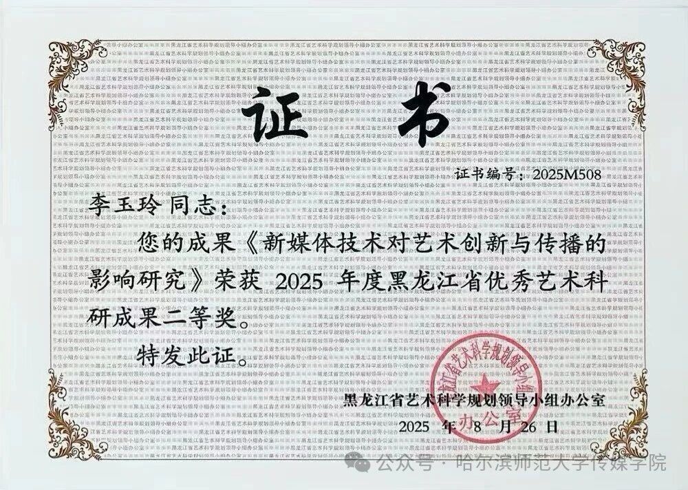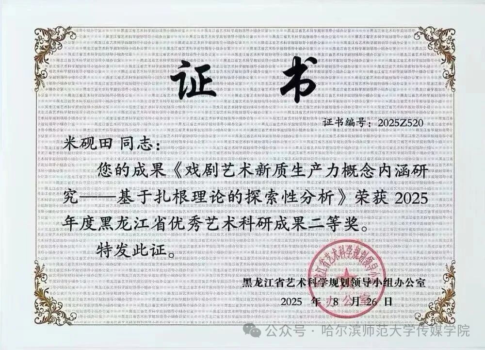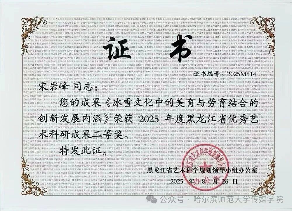 近日,2025年度黑龙江省优秀艺术科研成果奖成绩已经公布。我院共获得6项科研成果。贺楠、宋岩峰、孙旸、米砚田、李玉玲获得二等奖。黄世晴获得三等奖。
