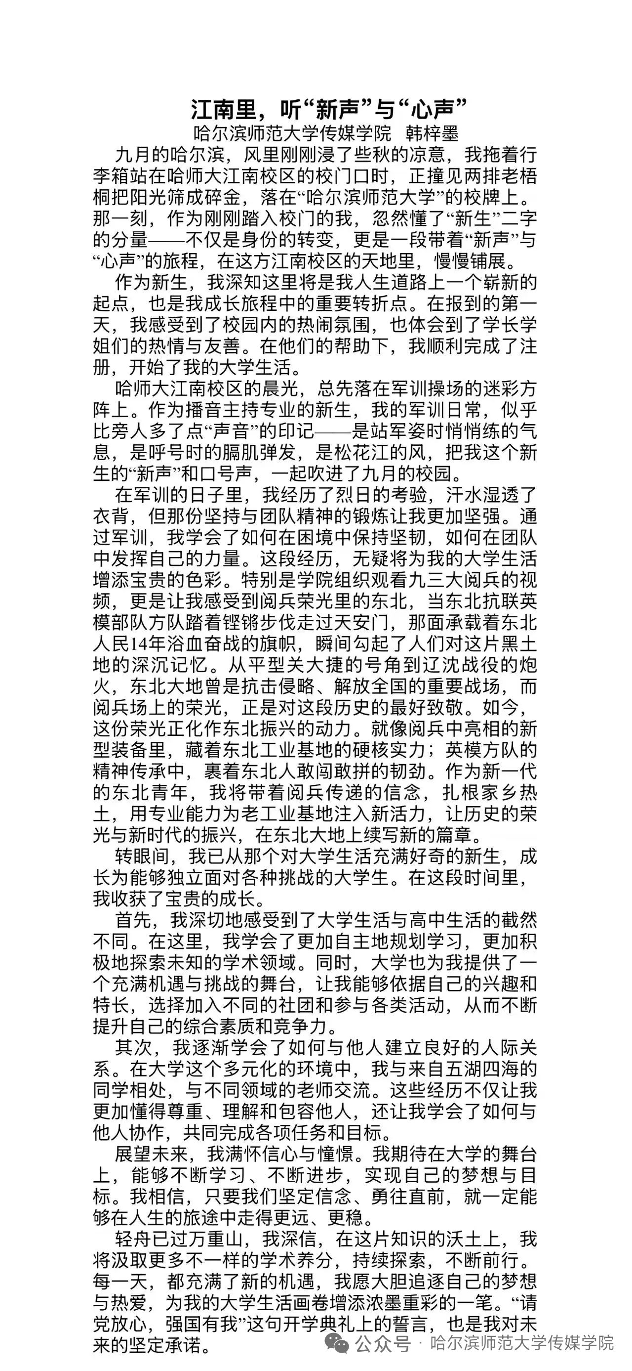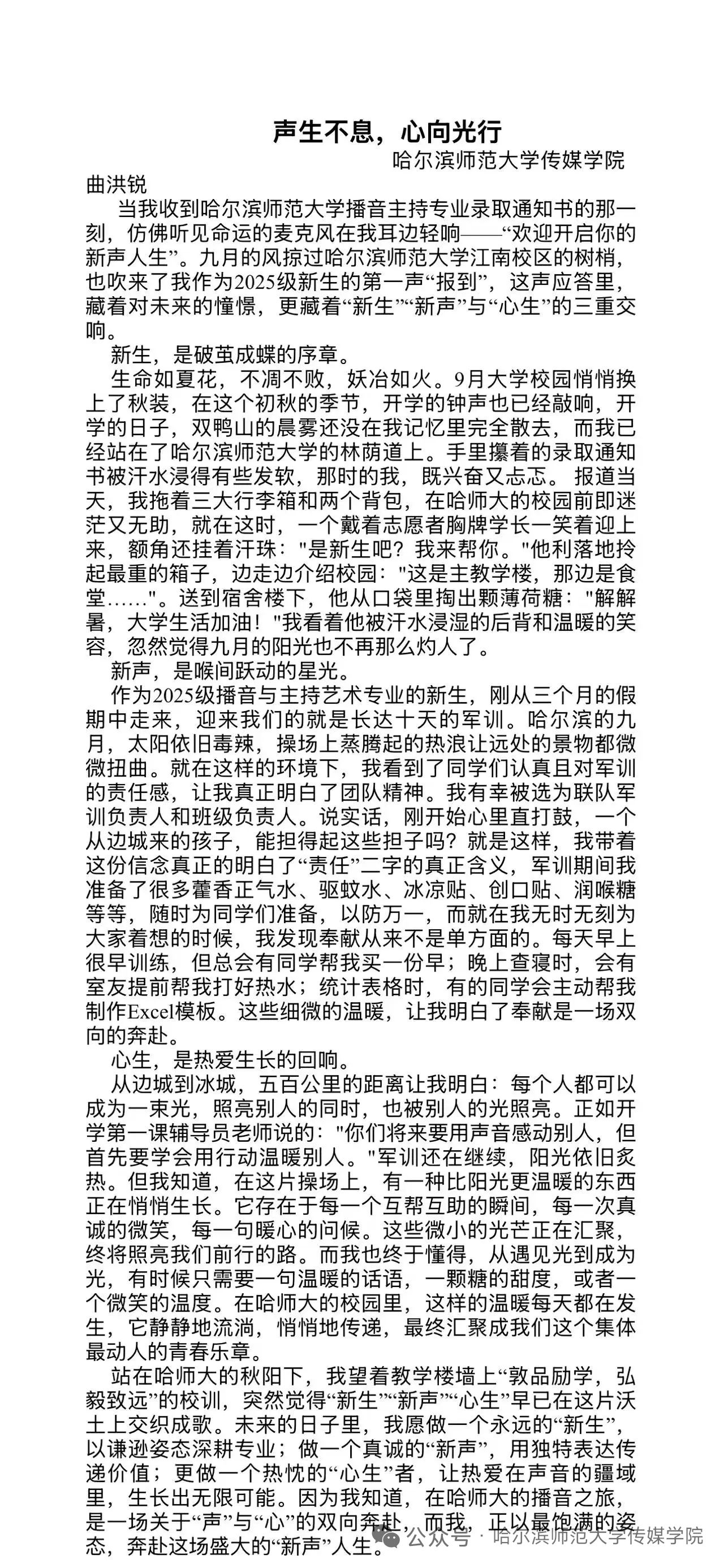 “新生·新声·心声”“感悟·感动·感激主题征文获奖名单本次活动面向学院全体大一新生,以文字为载体,旨在引导新生抒发初入大学的细腻心绪,探索大学生活的多元风貌,进而激发其爱校敬师之情,厚植母校情怀与集体主义精神。活动启动后,得到新生群体的积极响应,累计收到多篇优质投稿。经多轮严格选拔与专业审核,现将获奖名单正式公布。