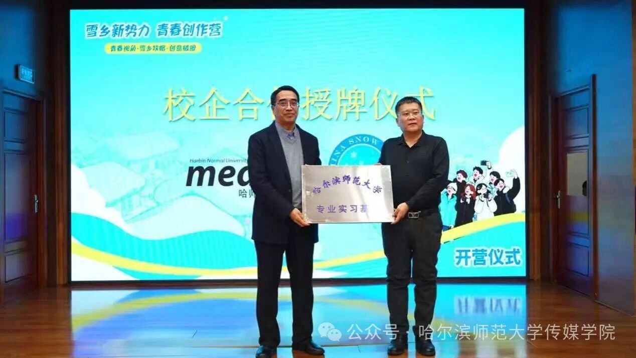 开营仪式上,传媒学院与龙江森工集团大海林林业局有限公司正式签署校企战略合作协议,传媒学院党委书记张立辉与大海林林业局有限公司党委委员、纪委书记张喆共同为“哈尔滨师范大学艺术硕士专业学位研究生联合培养基地”“哈尔滨师范大学专业实习基地”揭牌。