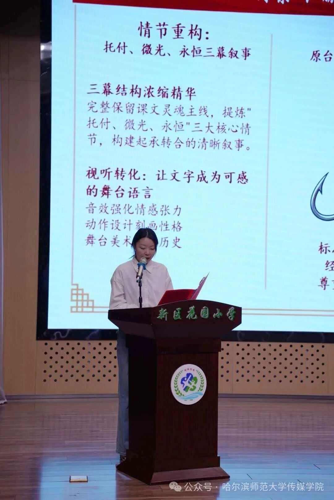 哈师大传媒学院表演系主任王晓玲在发言中表示,将充分发挥专业优势,为学生搭建更多走进小学、走进课堂的实践平台,让戏剧艺术成为大中小思政一体化的有效载体,也让学生在服务社会中提升专业能力与综合素养。
