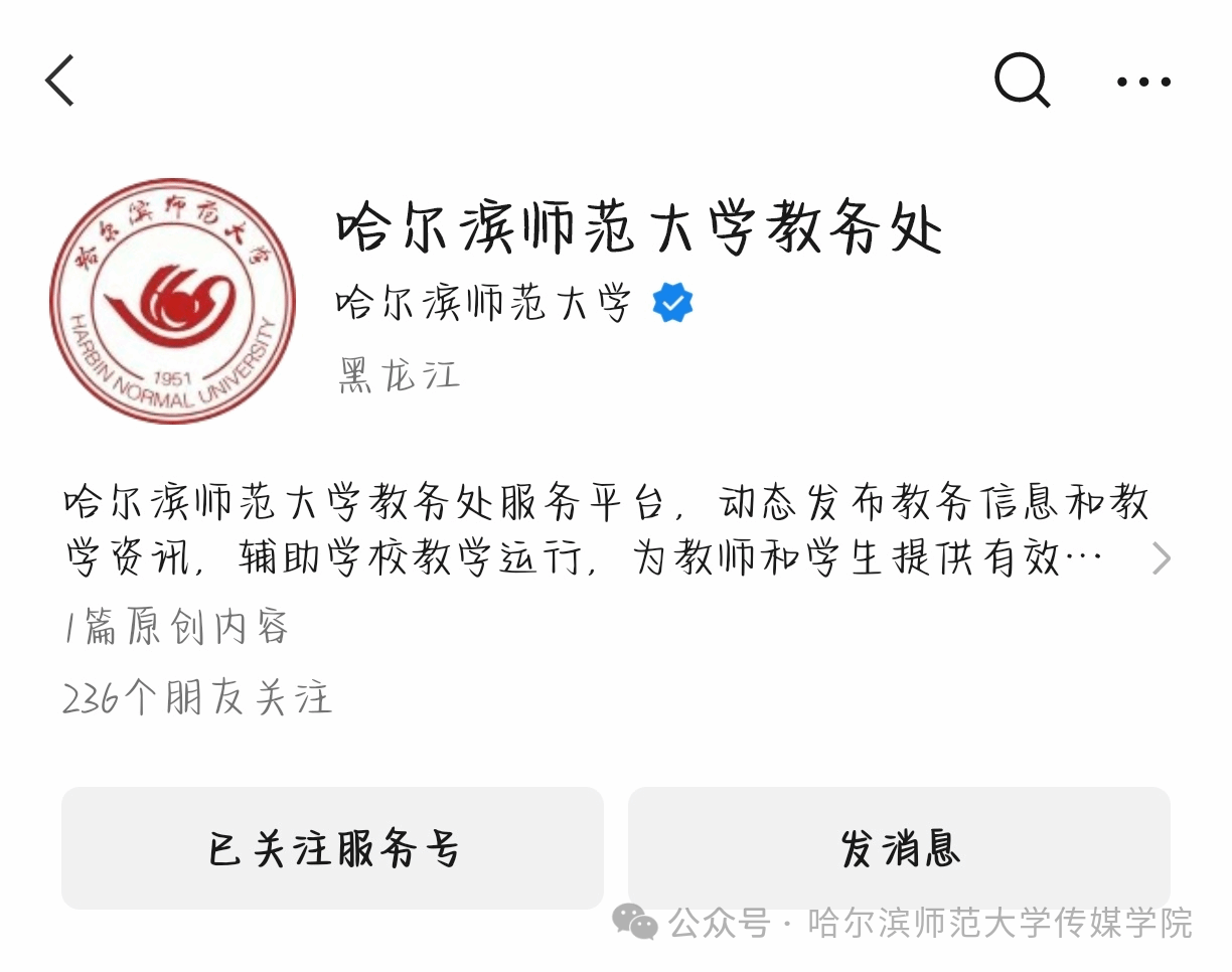 教务平台:关注“哈尔滨师范大学教务处”微信服务号,在教务平台上可以查看课程安排,查询课程成绩,体育课、选修课抢课等。(账号是学号,密码是学号+出生年月日)