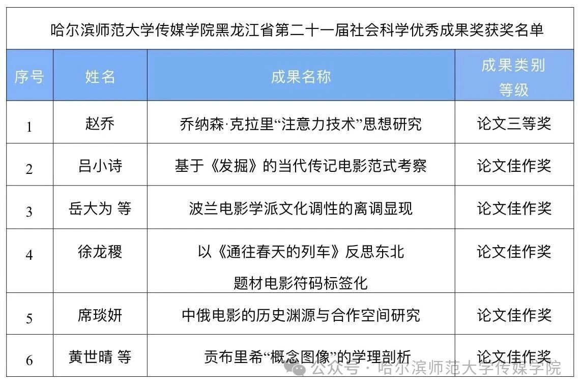 近日,黑龙江省第二十一届社会科学优秀成果奖评审结果正式公布,哈尔滨师范大学传媒学院获三等奖1项、佳作奖5项。具体获奖名单如下:
